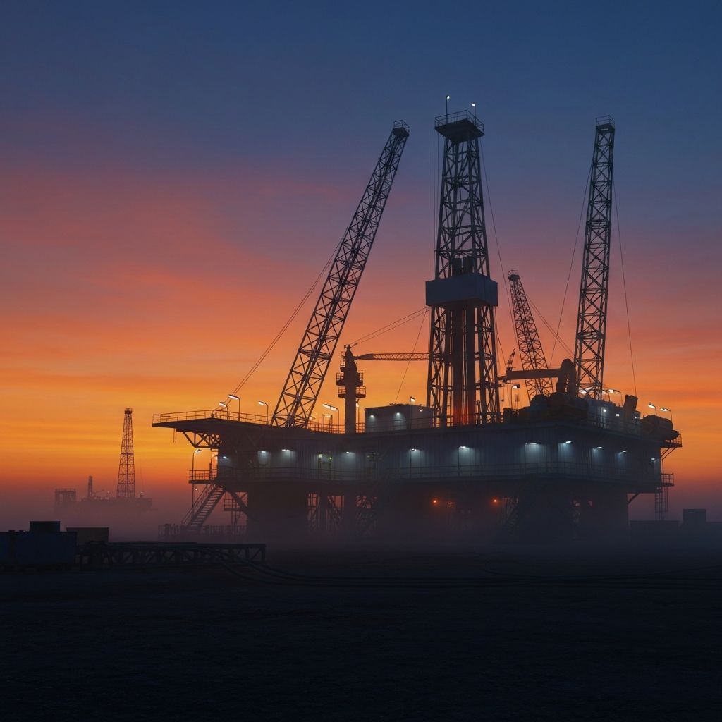 Детальная визуализация офшорной буровой платформы с поперечным сечением и анимацией технологических процессов бурения.